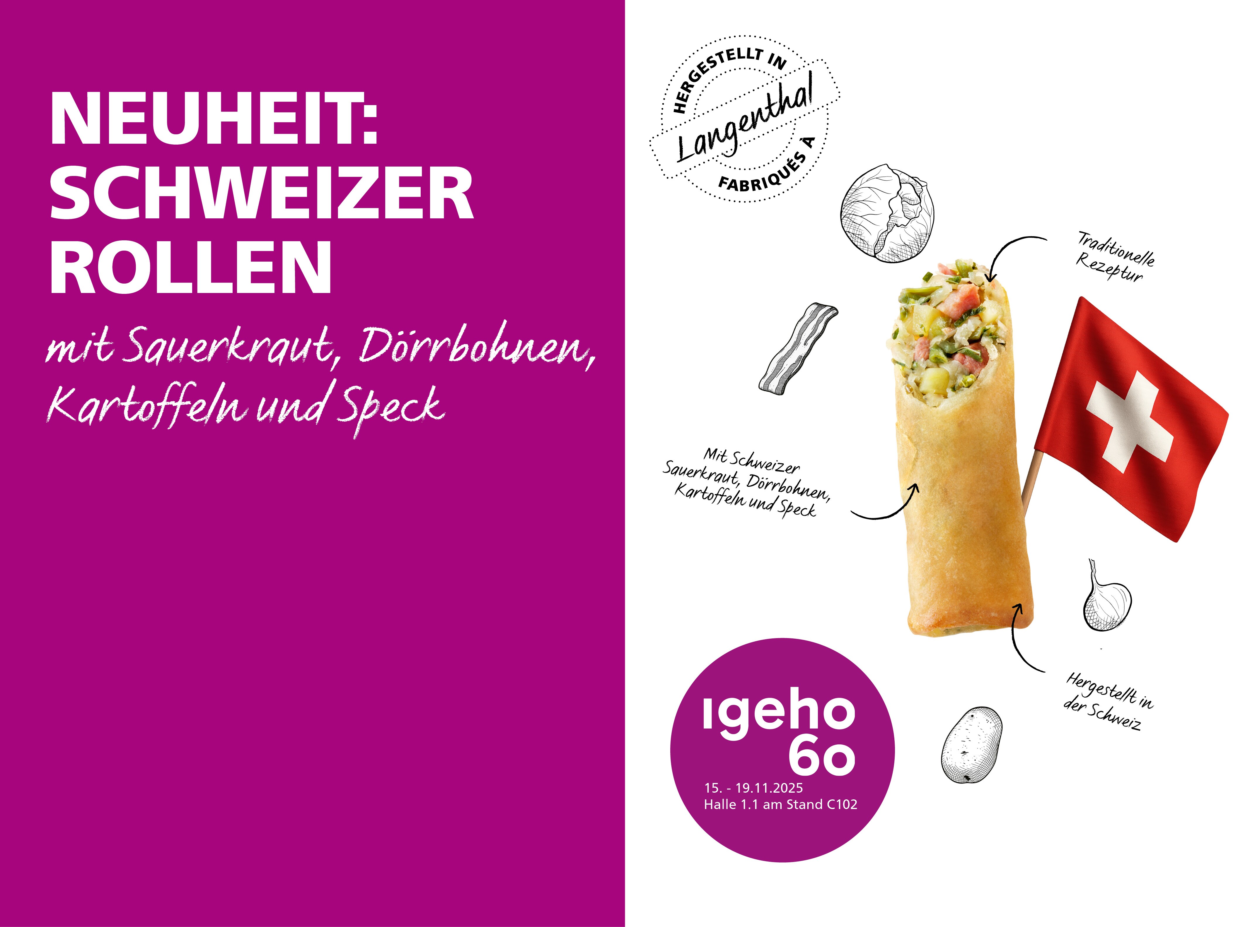 Entdecken Sie unter anderem die Schweizer Rolle, die in Langenthal mit höchster Qualität hergestellt wird. Inspiriert von der traditionellen Berner Platte, vereint sie typische Schweizer Zutaten wie Sauerkraut, Dörrbohnen, Kartoffeln und Speck in einem knusprigen Teig und bietet ein herzhaftes Geschmackserlebnis.